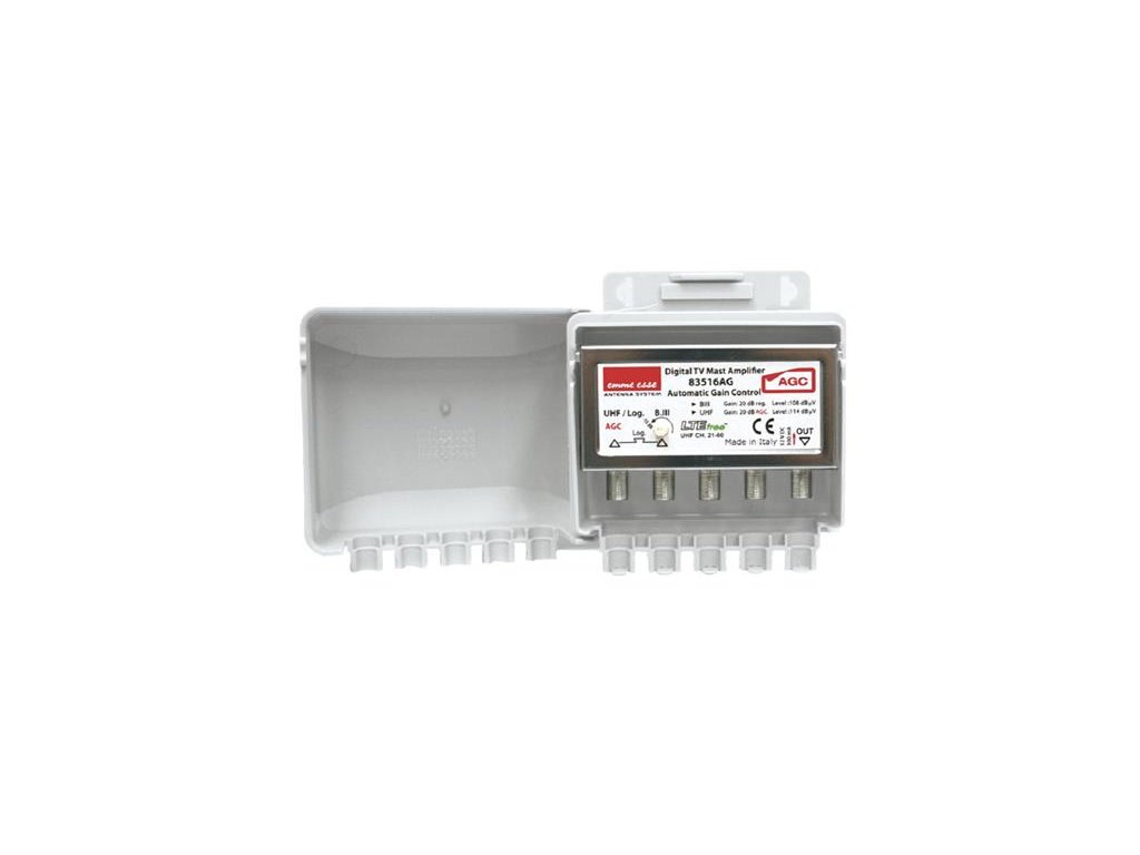 Anténny predzosilňovač Emme Esse 83516AG, na stožiar, +20dB, DAB(VHF) + UHF s AGC, filtr LTENový rad zosilňovačov s automatickou reguláciou zisku (AGC). Tento rad zahŕňa štyri verzie a to: 83516AG (skl.č. 14411303), 81942AG (skl.č. 14411302), 82462AG a 81942A5G, ktoré sa líšia zosilnením, šumovým číslom a max. Povolenú výstupnou úrovňou a filtrom LTE alebo 5G. Zosilňovač bol navrhnutý tak, aby spĺňal všetky požiadavky na príjem digitálneho televízneho signálu v súlade s platnými smernicami CE. Zosilňovač je vhodný pre montáž do vnútorného i vonkajšieho prostredia. Plastový kryt zosilňovača zaručuje zvýšenú ochranu proti poveternostným podmienkam a je prispôsobený ako k montáži na stožiar (max. priemer cca 55mm pomocou FeZn strmeňa sa závitmi M4) tak aj na stenu, vstupy a výstupy sú na F-konektory.