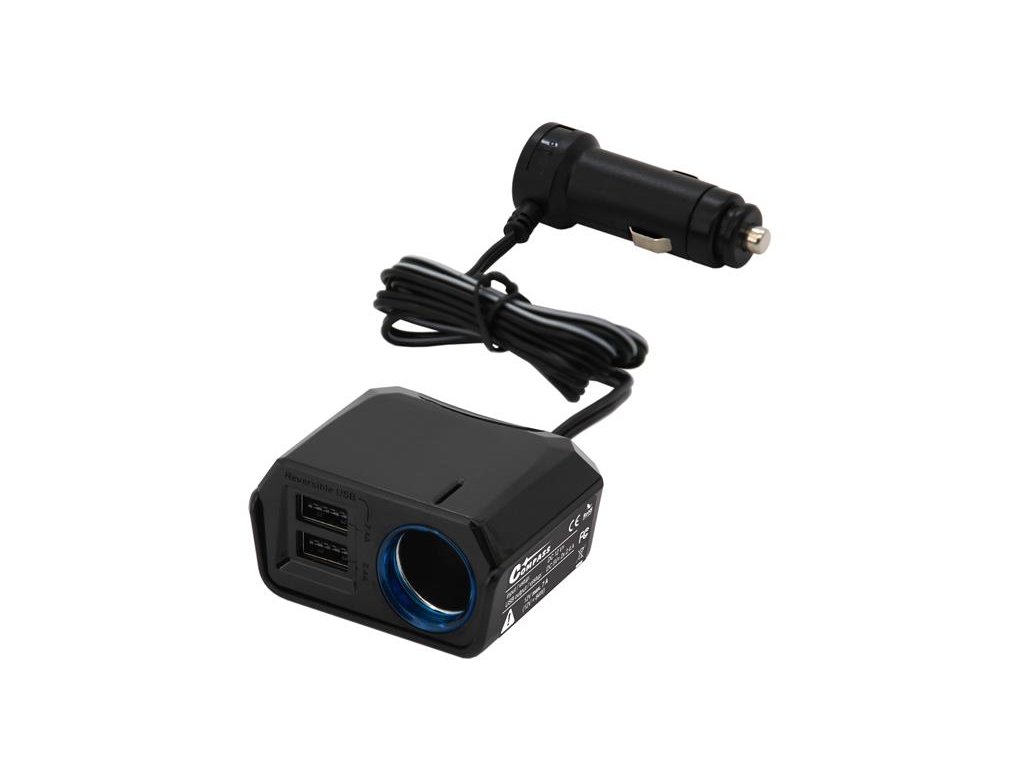 Adaptér je vybavený 2x DUAL-SIDE USB porty, pri ktorých je možné USB kábel do zástrčiek zapojiť úplne bežným spôsobom, ale aj naopak (s otočeným konektorom). Oba USB porty ponúkajú napájanie do 2,4 A. Adaptér je navyše vybavený aj výstupom pre napájanie 12V zariadení do 7 A.