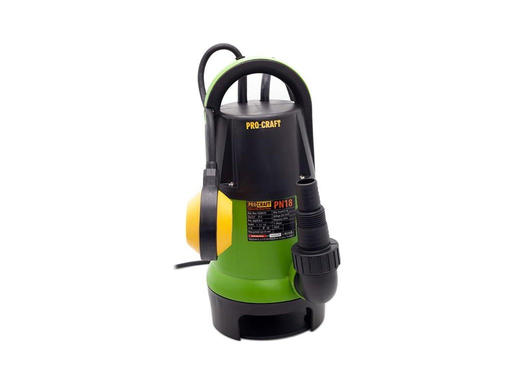 Vodné kalové čerpadlo Procraft PN18 je určené na odčerpanie čistej i znečistenej vody s prímesou drobných častí z nádrže, rybníka, jazierka. Silný motor s príkonom 750 W zaručí výkonnosť 12500 litrov za hodinu čistej a znečistenej vody do výšky až 8m a zvládne odsať mäkké nečistoty až do 35mm. Plavákový spínač automaticky zapína a vypína čerpadlo v závislosti od poklesu hladiny. Čerpadlo je vybavené tepelnou poistkou preťaženia, ktoré vypne pri 36 °C. Súčasťou čerpadla je 10m dlhý prívodný kábel s vidlicou. Balenie kartón.