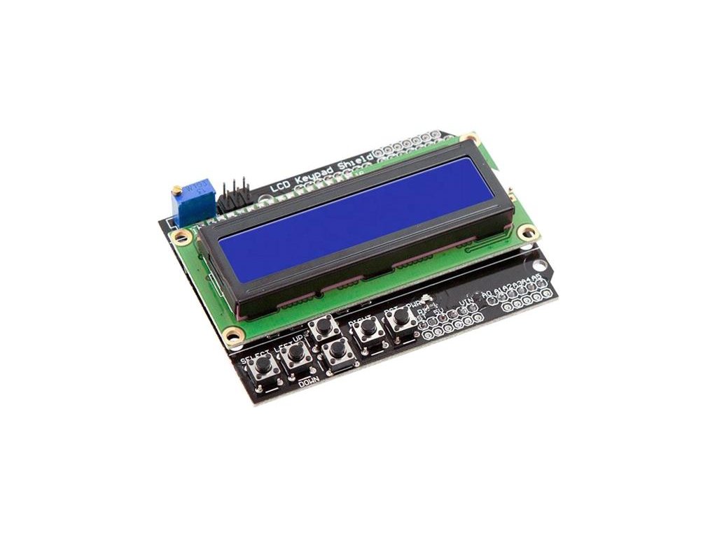 Arduino shield so 6 tlačidlami. Displej 16 × 2, modré podsvietenie, biela písmená. Radič HD44780.