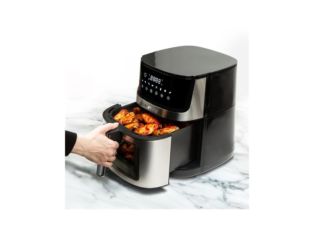 Jedným z obľúbených kuchynských nástrojov zdravých jedákov je teplovzdušná fritéza, s ktorou pripravíte jedlo rýchlo aj bez pridaného oleja!Táto špeciálna fritéza Airfryer nielen smaží jedlo, ale ponúka revolučný prístup k príprave zdravých a chutných jedál.Dvojúrovňový systém ohrevu zaisťuje rovnomerné rozloženie tepla a zároveň urýchľuje čas ohrevu a pečenia.Vďaka ohrievaciemu vlákno na vrchnej aj spodnej časti košíka na pečenie sa jedlo dokonale upečie.Proces pečenia môžete sledovať cez priezor v prednej časti veľkého koša.Obrovská kapacita koša 7,5 l umožňuje pripraviť väčšie množstvo jedla, vďaka čomu je ideálnou voľbou pre rodinné a priateľské večere a stretnutia.