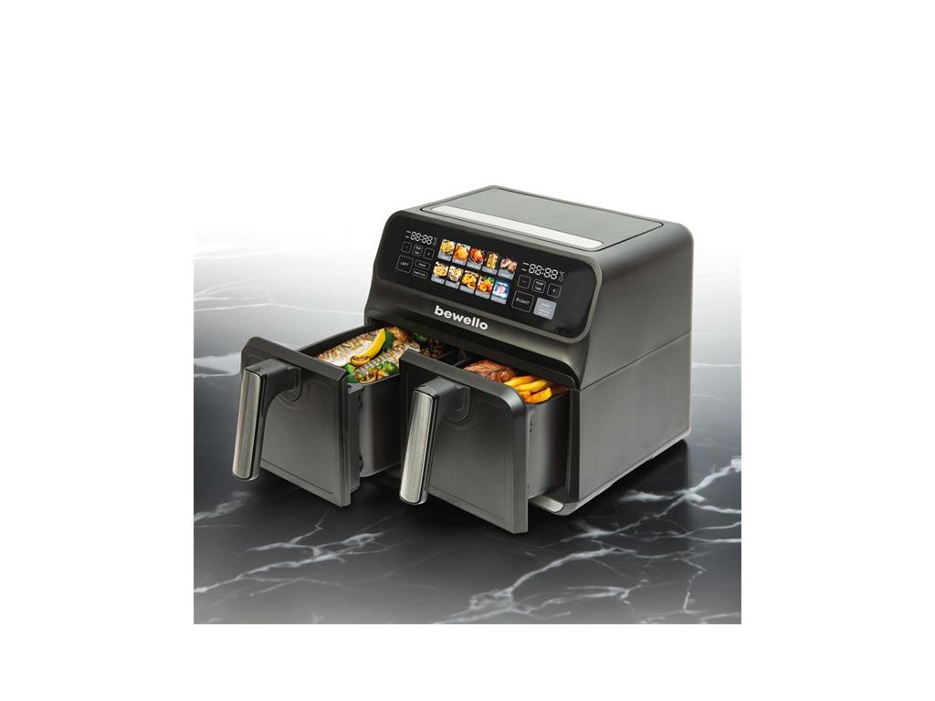 Jedným z obľúbených kuchynských nástrojov zdravých jedákov je teplovzdušná fritéza, s ktorou pripravíte jedlo rýchlo aj bez pridaného oleja!Tento špeciálny Airfryer nielen varí chutné jedlo, ale ponúka aj revolučný prístup k príprave zdravých a chutných jedál.Vďaka dvojitému košíku môžete súbežne piecť jedlá, ktoré vyžadujú rôznu teplu a dĺžku pečenia.Vďaka dotykovému displeju si jednoducho vyberiete, ktoré jedlo budete v akom košíku piecť a prístroj automaticky reguluje teplotu a čas pečenia.Obrovské košíky s celkovou kapacitou 8L, Vám umožnia pripraviť veľké množstvo jedla pre celú rodinu, priateľov alebo na rodinné oslavy.