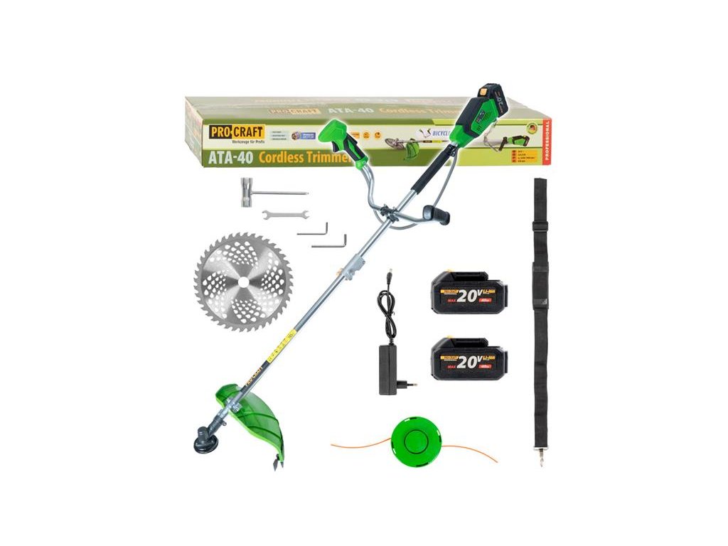 AKU krovinorez Procraft ATA-40 je určený na kosenie a vyžínanie trávnatých plôch, na odstránenie burín. Silný a tichý motor s otáčkami až 7000 zaručuje dlhú bezporuchovú prácu. Možnosť plynulej regulácie otáčok kosenia v závislosti na hustote a sile porastu a požiadavke na presnosť práce. Stroj je dodávaný v kartóne s 2 batériami 20V 4Ah, nabíjačkou, jednoramenným popruhom, strunovou hlavou, kovovým kotúčom, montážnym kľúčom. Balenie kartón.