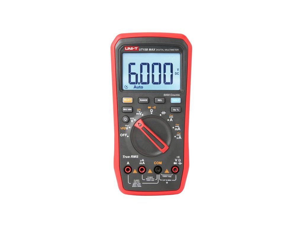 Digitálne multimetre UT15B MAX je spoľahlivý digitálny multimeter typu True-RMS. Multimeter je navrhnutý tak, aby odolával rušeniu a dokáže odfiltrovať rušenie od nosnej frekvencie prekrytej sínusovým signálom alebo signálom rôzneho skreslenia napätia a je schopný merať výstupné napätie pohonu s premenlivou frekvenciou. V režime jednosmerného/ striedavého napätia môže prístroj vykonávať meranie frekvencie a pracovného cyklu.