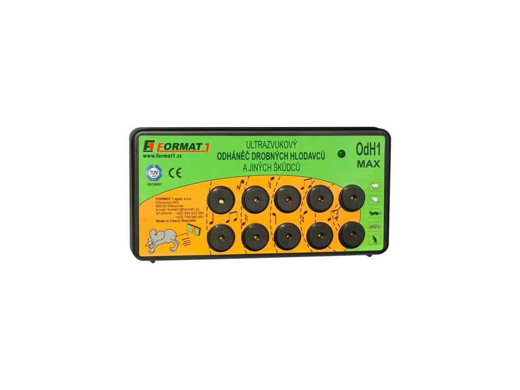 Odpudzovač FORMAT OdH1-MAXZvukovo-ultrazvukový elektronický odháňač myšou, kún, krýs, lasičiek a potkanov. Jedná sa o rýdzo český produkt s dlhoročnou tradíciou na trhu (od r. 1991) vyrábaný priamo u nás vo firme FORMAT1 spol. s r. o. Spoľahlivý, výkonný, za dobu viac ako 29 rokov overený mnohými zákazníkmi. Neškodný ako pre človeka a domáce hospodárske zvieratá.
