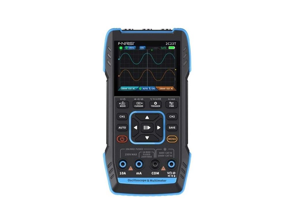 Osciloskop FNIRSI 2C23T je ručný osciloskop, generátor funkcií a multimeter. Toto zariadenie kombinuje niekoľko praktických funkcií. Osciloskop má šírku pásma 10 MHz, vzorkovaciu frekvenciu 50 MS/s a 2 kanály. Navyše má funkciu ukladania priebehu, ktorá umožňuje ukladanie a neskoršiu analýzu dát. Funkčný generátor má jeden kanál, frekvenčný rozsah 1Hz-2MHz a amplitúdu 0,1-3,3V. Funkčný generátor môže tiež vydávať 7 rôznych priebehov. Multimeter má 10 000 impulzov a podporuje meranie AC/DC napájania a prúdu. 2C23T má 2,8" farebný LCD displej a je napájaný vstavanou 3000mAh batériou, ktorá ponúka až 6 hodín nepretržitého používania v pohotovostnom režime.