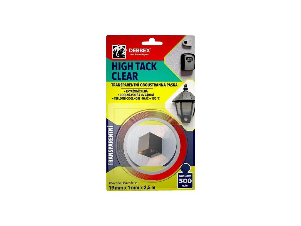 Obojstranná páska HIGH TACK CLEAR s extra hrubou akrylátovou lepiacou vrstvou. Priľne k širokej škále podkladov, a to veľmi silno. Má veľkú výhodu v priehľadnom spoji a okamžitej plnej prídržnosti, tým urýchľuje montáž a uvedenie lepeného predmetu do prevádzky.