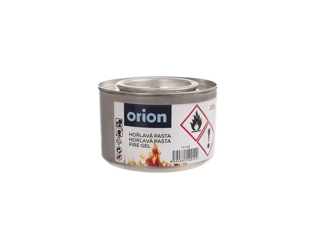 Pasta horľavá ORION Firegel 200gHorľavá pasta Firegal pre fondue, prenosné variče a stolové grily, do pochodňou, na horských túrach a všade tam, kde potrebujete použiť plameň. Zaisťuje bezpečný plameň bez zápachu a dymu.