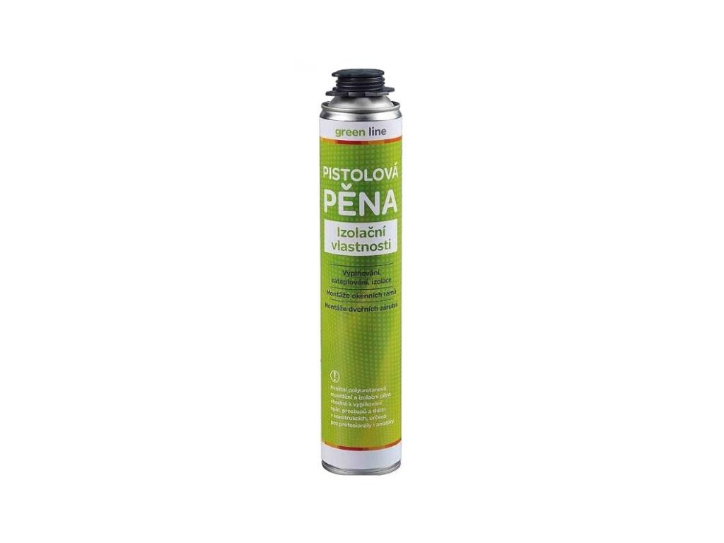 Pena DEN BRAVEN Green Line montážna pištoľová 750mlV PROFI prevedení pre presnú a úspornú aplikáciu pomocou aplikačnej pištole. K montáži dverných zárubní a okenných rámov, vyplňovanie dutín, montážnych priestorov medzi panelmi, murovanými priečkami, stropom a podlahou, priechodov elektrického vedenia.