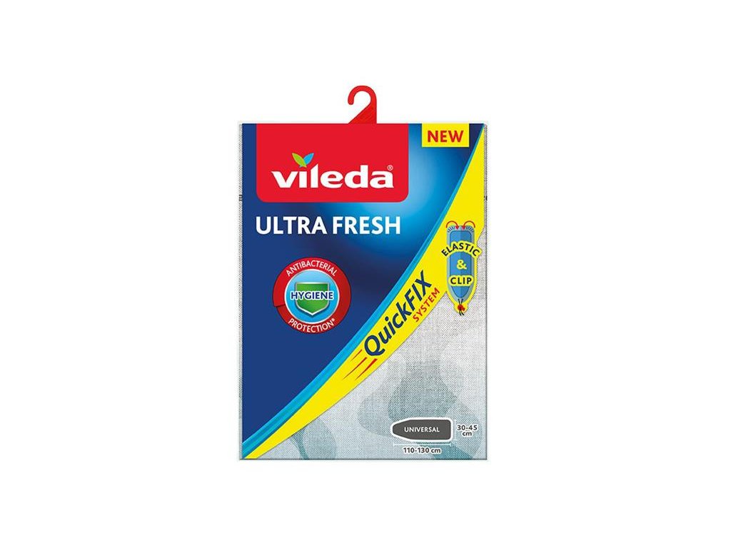 Poťah na žehliaca doska Vileda Ultra Fresh obsahuje antibakteriálnu ochranu, vďaka ktorej sa vo vnútri poťahu nezhromaždí baktérie. Tento poťah má dve vrstvy: antibakteriálne penu a antibakteriálne bavlnený poťah. Chlorid strieborný bráni rastu baktérií v poťahu až o 99,9% a povrch znemožňuje baktériám prežívať a ďalej sa množiť. Tento poťah je vhodný na všetky druhy dosiek so šírkou 30-45 cm a dĺžkou 110-130 cm. Pripevnenie poťahu na dosku je jednoduché vďaka systému QuickFix. šnúrka na zaťahovanie zaistí vždy hladký povrch poťahu a žehlenie je tak komfortný. Ku komfortu počas žehlenia prispieva i materiál poťahu. Je vyrobený zo 100% bavlny s 5 mm hrubou penovou antibakteriálne výplňou.