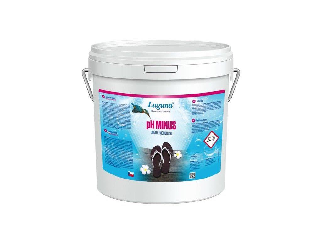 Prípravok znižuje hodnotu pH bazénovej vody. Prípravok je určený na zníženie hodnoty pH bazénovej vody. Použitie: Pre najväčšie pôsobenie chlóru bez vedľajších vplyvov je nutné upraviť hodnotu pH bazénovej vody na 6,8-7,6. Pri hodnotách nad 7,6 sa vo vode môžu vyskytovať zákaly, ktoré môžu spôsobiť upchatie filtra, zníženie účinnosti dezinfekčných prípravkov, zápach po chlóre, podráždenie očí a pokožky. V tomto prípade je nutné na úpravu vody a zníženie hodnoty pH použiť prípravok Laguna pH mínus.
