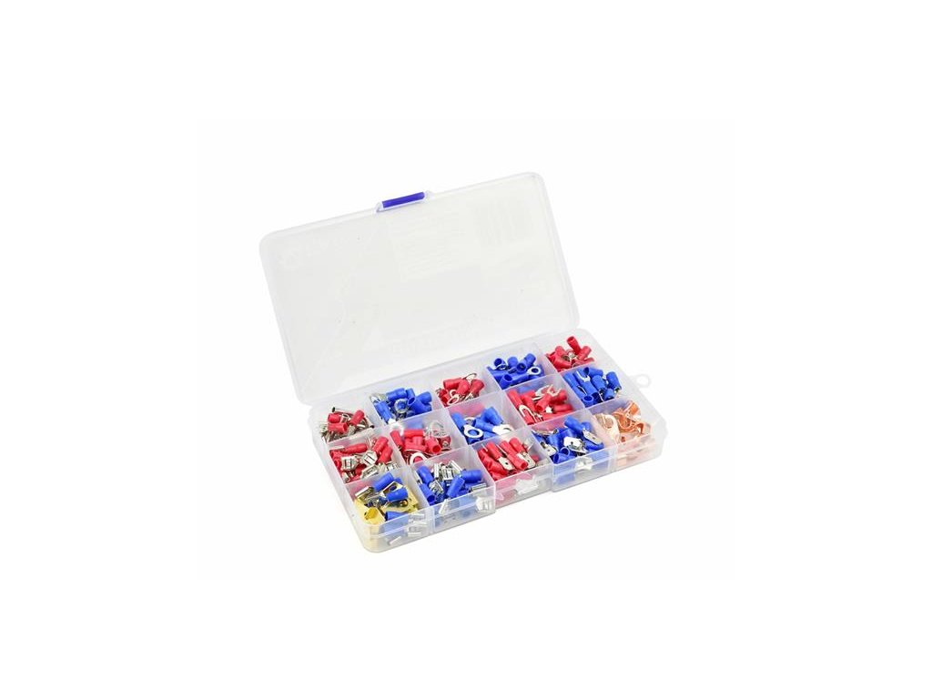 Súprava izolovaných konektorov na zakončenie káblov. Krimpovacie konektory sú obzvlášť užitočné pre vytváranie káblových koncoviek na lankových drôtoch. Použitie káblových spojok zaručuje solídnu údržbu všetkých voľných vodičov v kábloch na jednom mieste. To značne znižuje možnosť skratu. Izolované konektory z pocínovanej medi a PVC izolácie.