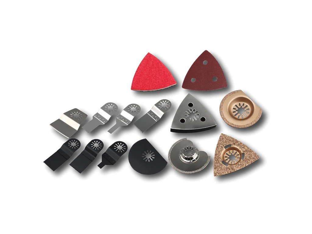 Sada nástavcov FIELDMANN FDB 9002 k multifunkčnej brúskeŠtyridsať dielna sada nástavcov k oscilačným brúskam, ktorá sa skladá z nástavca na brúsenie, leštiacej podložky, pílových kotúčov okrúhleho tvaru, pílových listov na výrezy otvorov do dosiek alebo sadrokartónu, nožov špachtľovitého tvaru na odrezávanie starých díc a obkladačiek aj brúsenie stvrdnutej lepiacej hmoty. Nástavce sú kompatibilné oscilačnými brúskami iných značiek.