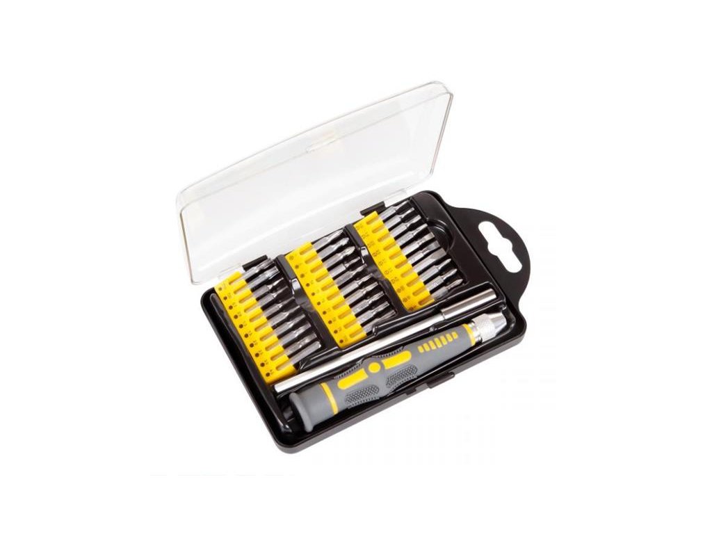 Sada obsahuje rôzne typy bitov vrátane: plochých, PH, PZ, Torx a Hex. Rýchloupínacie zariadenie kombinované s magnetickou predlžovacou rukoväťou umožňuje bezpečnú, pohodlnú a jednoduchú prácu. Sada je vyrobená z chróm-vanádiovej ocele, ktorá je odolná voči korózii a hrdzi, a bude vám slúžiť veľmi dlho. Používajte presný skrutkovač Rebel Tools a robte bez obmedzenia to, čo vás baví!