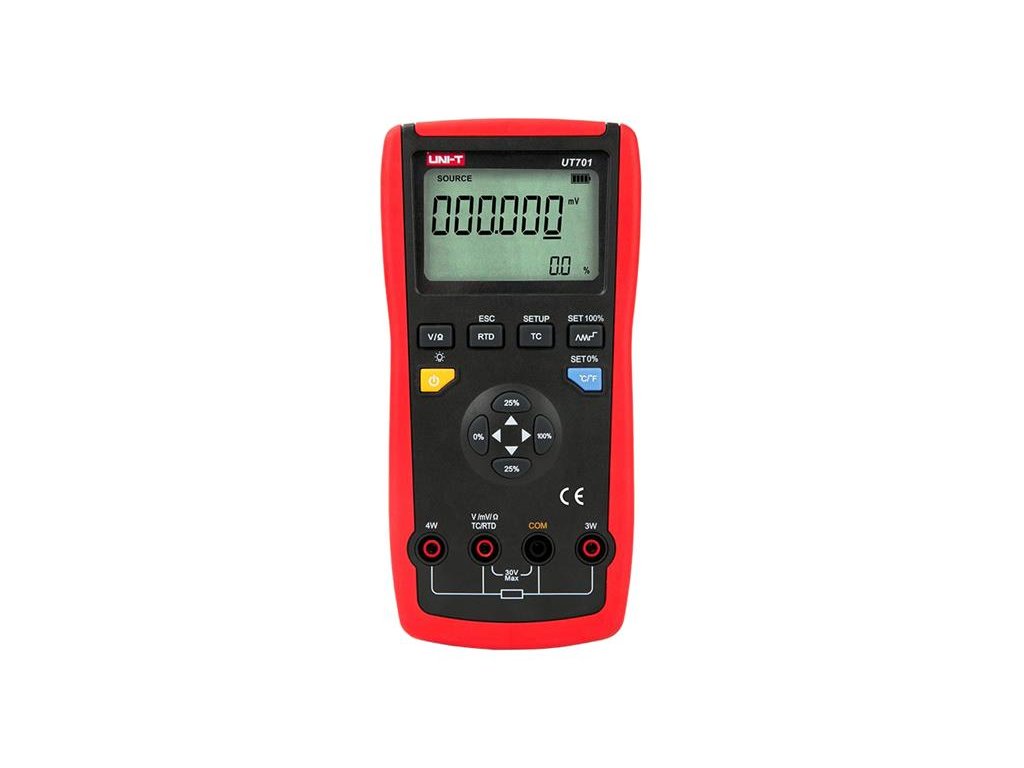Simulátor termočlánkov pre kalibráciu teploty UNI-T UT701Prístroj UT701 je jednoúčelovým veľmi presný profesionálny kalibrátor pre testerov termočlánkov rôznych druhov. Je vhodný pre užívateľov na kalibráciu a opravám rôznych teplotných testerov pomocou simulácie termočlánkov (10 typov termočlánkov) alebo odporových teplotných detektorov (4 typy RTD) a funkciou výstupu napätie / odporu (ručne, alebo automaticky krokovo meniteľných). Ľahko ovládateľné klávesy, voliteľné kroky a výstupy rampy zvyšujú efektivitu a presnosť operácií. Je vybavený nastaviteľným podsvietením LCD, automatickým vypínaním, dvojfarebným injekčným plastovým puzdrom a odolnosťou proti pádu z výšky 1 m. Automatický test kalibrátora a displeja pri zapnutí prístroja. Nastaviteľné podsvietenie displeja. Možnosť troch alebo štvorvodičového meraní termočlánkov. Manuálne alebo automatické simulácia studeného konca termočlánku.
