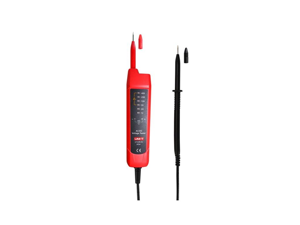 Skúšačka UNI-T UT22B-EUPrístroj UT22B-EU je jednoduchý tester napätia pre každodenné, jednoduché používanie pre elektrikárov a kutilov pre meranie prítomnosti AC / DC napätie na zásuvkách 230V, vypínačoch a elektrických spotrebičoch. Tento tester napätia má krytie IP54 proti vode a prachu a je navrhnutý tak, aby vydržal pád z výšky 2 metre. Skvelá vec na tomto produkte je, že nevyžaduje žiadnu batériu, jeho napájanie je zaistené testovaným napätím! UT22B umožňuje rozlíšiť veľkosť napätia od 12V do 400V (počtom svietiacich diód LED) a automaticky rozlišovať medzi jednosmerným a striedavým napätím (svieti indikátory "+" alebo "-" alebo oba súčasne). Presnosť indikácia úrovne napätia: príslušná LED sa obvykle plne rozsvieti pri pribl. 70% až 100% uvedeného rozsahu, s výnimkou rozsahu 12 V AC / DC, kde sa rozsvieti už pri 50% až 100% hodnoty napätia. Prístroj zodpovedá normám: EN61326-1: 2013, EN61326-2-2: 2013, EN61243-3: 2014.