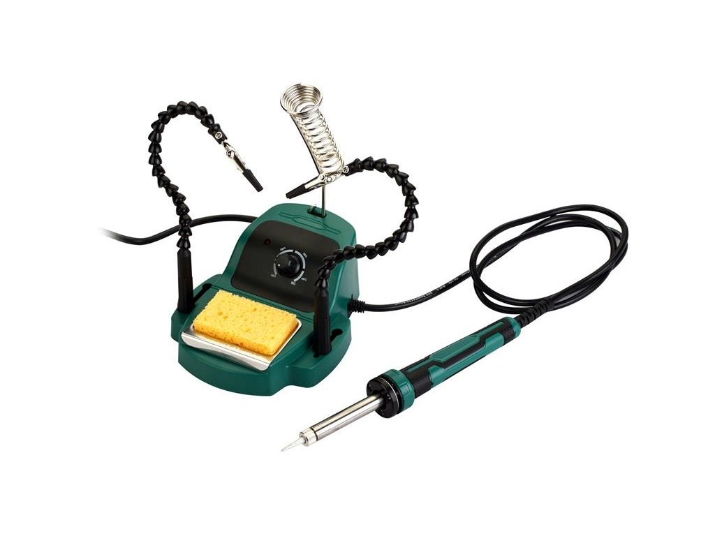 - 2 pomocné ruky otočné o 360 stupňov s izolovanými aligátorovými sponami, na uchytenie rôzne veľkých súčiastok a dosiek
