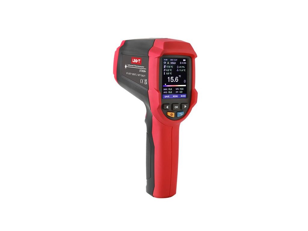 Profesionálny bezkontaktný infračervený teplomer UT305A+ dokáže rýchlo a presne určiť povrchovú teplotu v rozmedzí -50 °C až +1850 °C zmeraním infračervenej energie vyžarovanej z cieľového povrchu. Pre jednoduchšie a intuitívne zameranie prístroja na cieľový povrch je zabudovaný laser, ktorý indikuje správne zamierenie teplomera. Pomer vzdialenosti k priemeru meraného povrchu je u tohto prístroja 55 :1. Tento teplomer má zabudované ďalšie funkcie, napr. meranie teploty okolia teplomera, meranie teploty kontaktným termočlánkom typu K, meranie relatívnej vlhkosti okolia teplomera. Na základe týchto zmeraných hodnôt sám vypočíta teplotu rosného bodu alebo teplotu vlhkého teplomera. Do teplomeru je možné zadať systémový čas a dátum. Meranie hodnôt je možné naplánovať vo vopred stanovených intervaloch a celkom 999 udalostí (skupín dát) uložiť do internej pamäte. Je možné prednastaviť emisivitu meraného povrchu v rozmedzí 0,1 až 1,0. Indikáciu prednastavených funkcií a nameraných hodnôt zaisťuje jasný a vysoko kontrastný TFT LCD farebný displej a hraničné hodnoty sú indikované bzučiakom a na displeji. Je možná indikácia minimálnych, maximálnych a priemerných teplôt a odchýlok od priemeru (MIN, MAX, AVG, DIF). Prístroj je odolný proti pádu z výšky 1 metra.